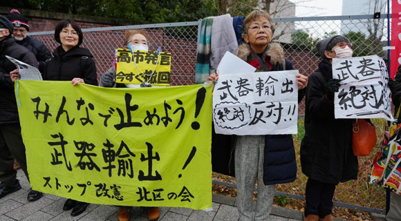 针对日本执政联盟自民党与日本维新会拟取消对武器出口的5种类型限制、为武器出口大幅“松绑”,日本民众25日下午在位于东京的自民党总部前举行抗议集会。根据现行“防卫装备转移三原则”运用指南,日本向其他国家出口的防卫装备原则上仅限于救援、运输等5种以后勤用途为主的武器类型。