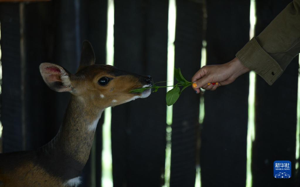 2月4日,游客在肯尼亚纳纽基肯尼亚山野生动物保护区的动物孤儿院内给羚羊喂食。