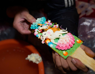 8月12日,野象羊妞(左)和小伙伴龙龙一起品尝自己的9岁生日宴。