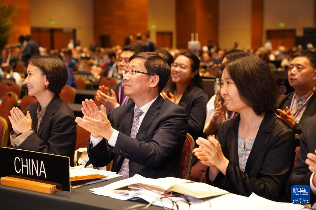 12月5日,在巴拉圭亚松森联合国教科文组织保护非物质文化遗产政府间委员会第19届常会评审现场,中国代表团庆祝。