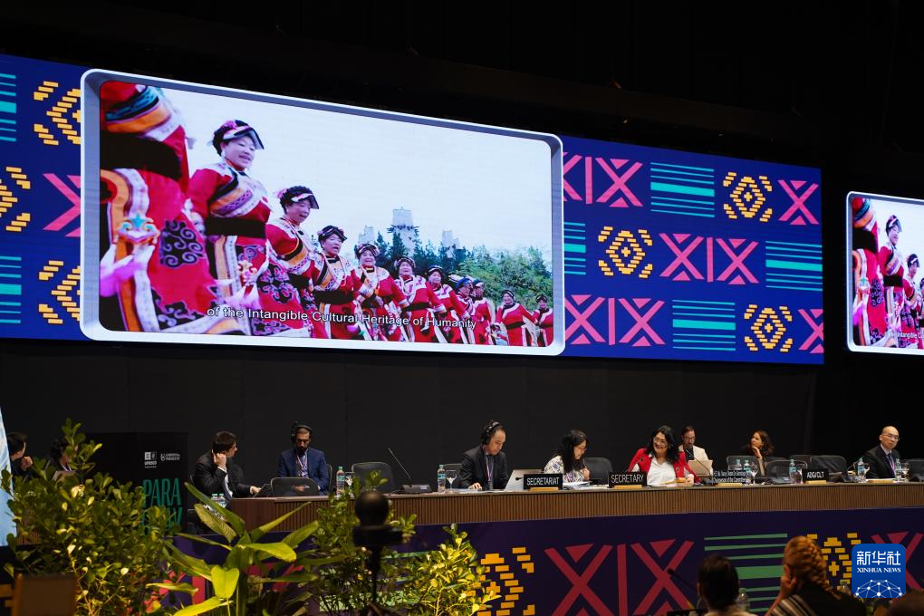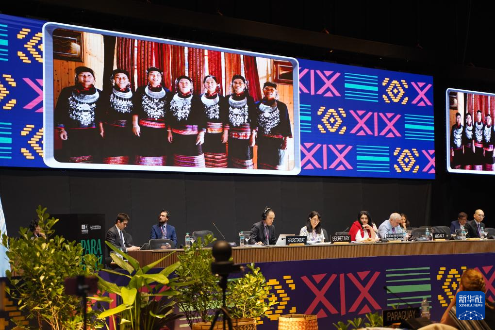 12月5日,在巴拉圭亚松森联合国教科文组织保护非物质文化遗产政府间委员会第19届常会评审现场,大屏幕播放“黎族传统纺染织绣技艺”宣传视频。