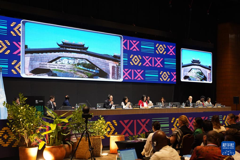 12月5日,在巴拉圭亚松森联合国教科文组织保护非物质文化遗产政府间委员会第19届常会评审现场,大屏幕播放“中国木拱桥传统营造技艺”宣传视频。
