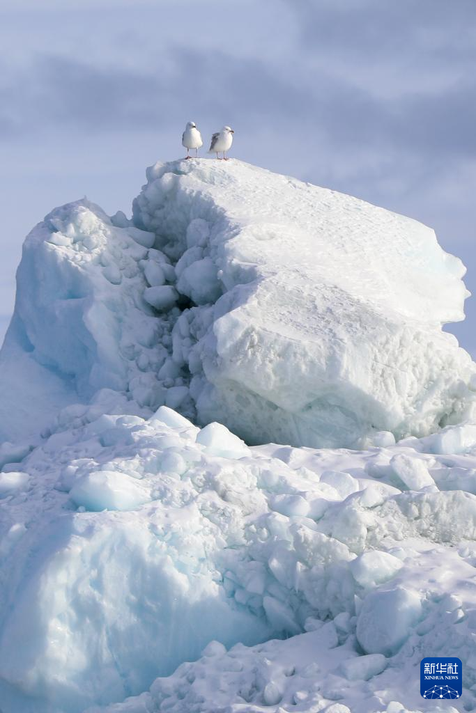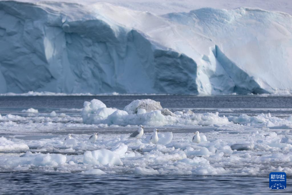 这是3月22日在丹麦自治领地格陵兰岛迪斯科湾拍摄的停在浮冰上的海鸟。