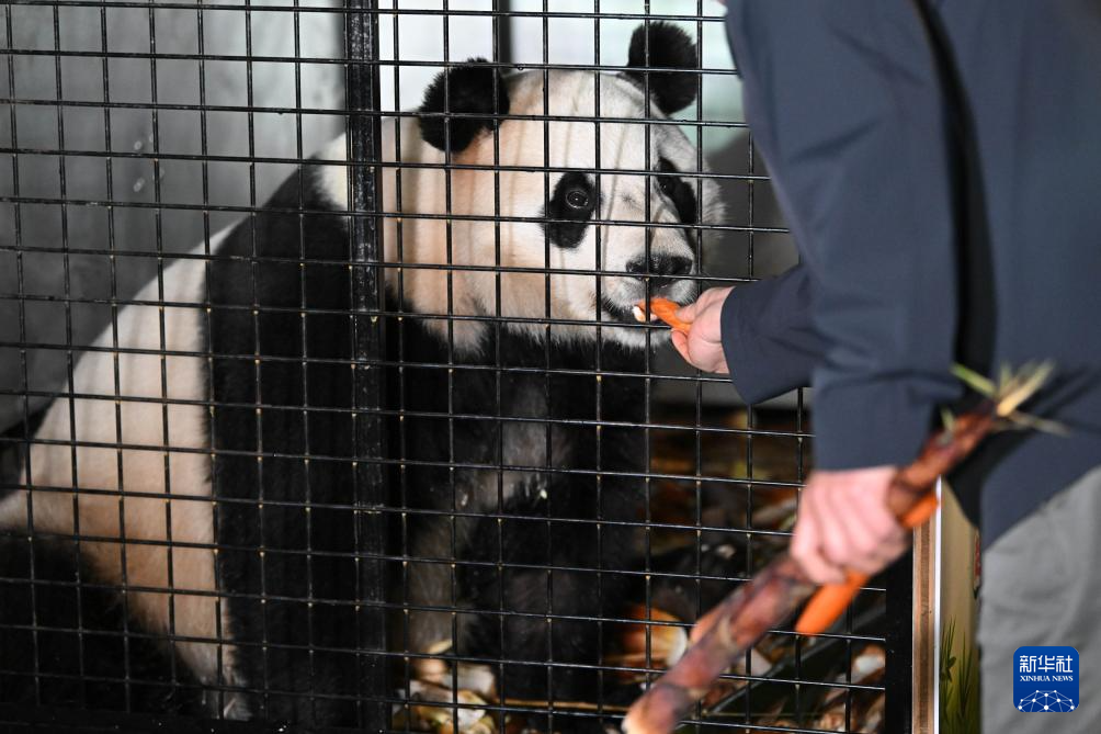 4月22日,在中国大熊猫保护研究中心都江堰基地,工作人员给大熊猫“兰韵”投喂胡萝卜。