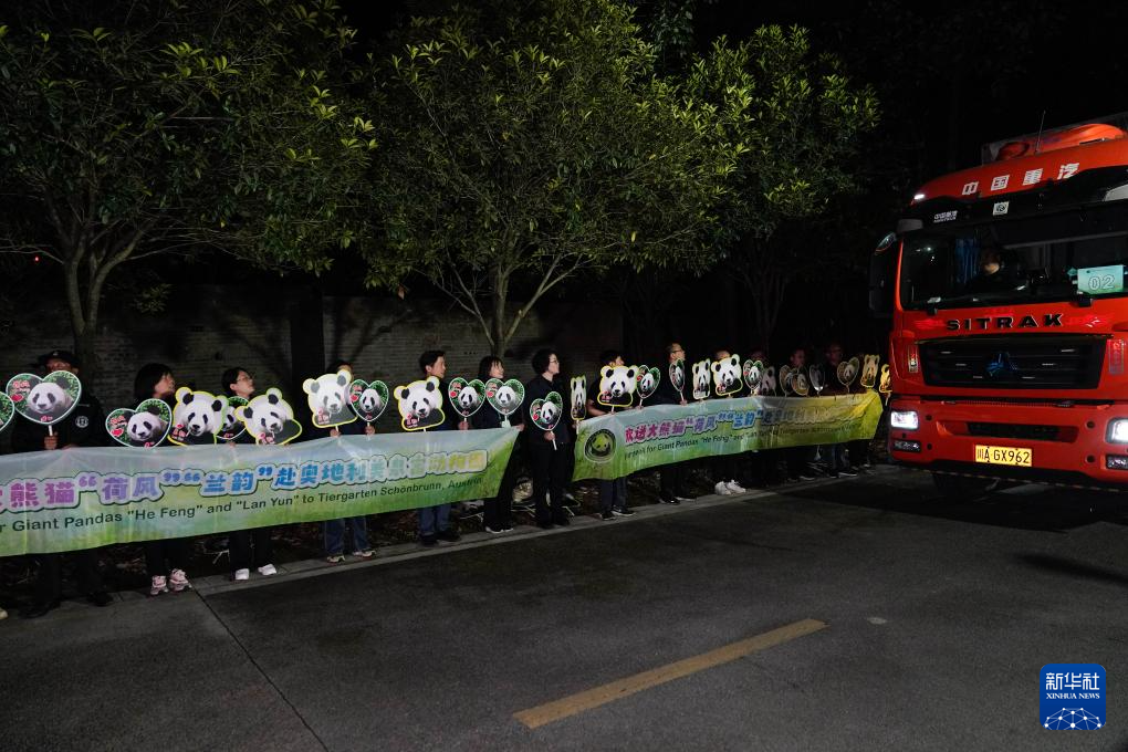 4月22日,中国大熊猫保护研究中心工作人员欢送大熊猫“荷风”“兰韵”赴奥地利。