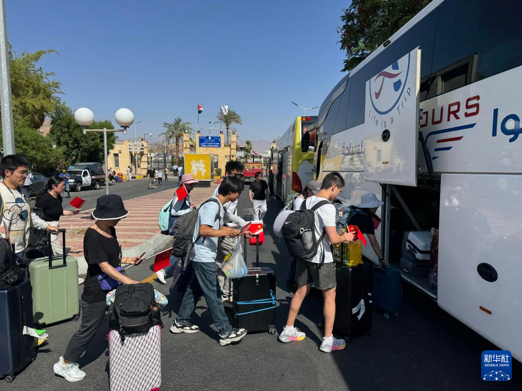 6月19日,在埃及南西奈省塔巴口岸,从以色列撤离的中国公民乘车离开。