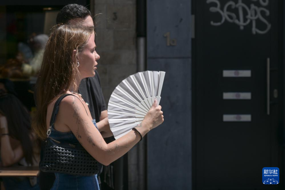 6月30日,在比利时布鲁塞尔,一名女子用扇子降温。