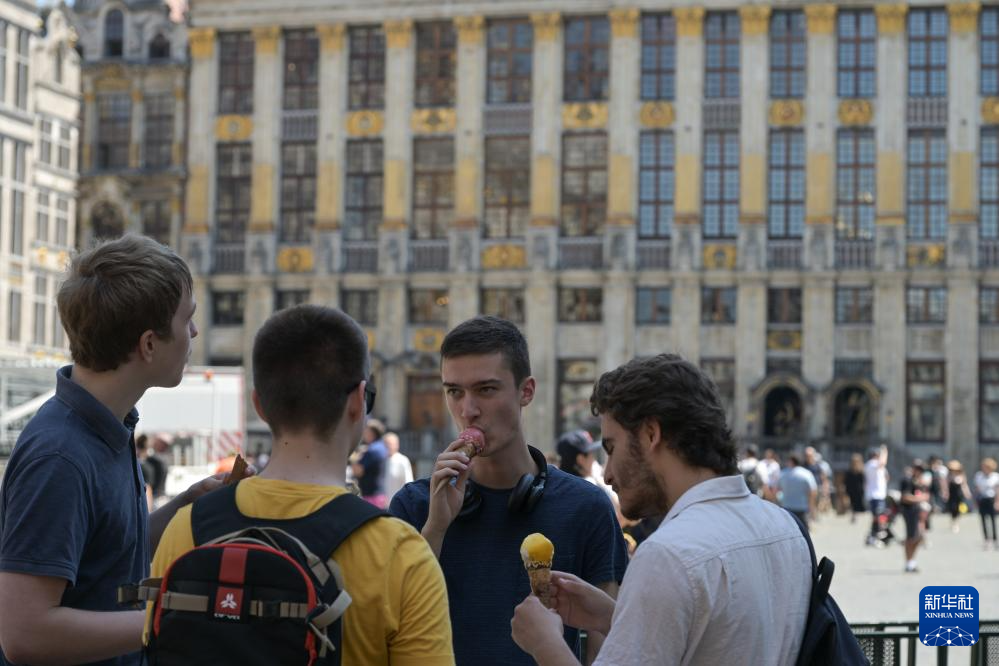 6月30日,人们在比利时布鲁塞尔大广场附近吃冰淇淋。