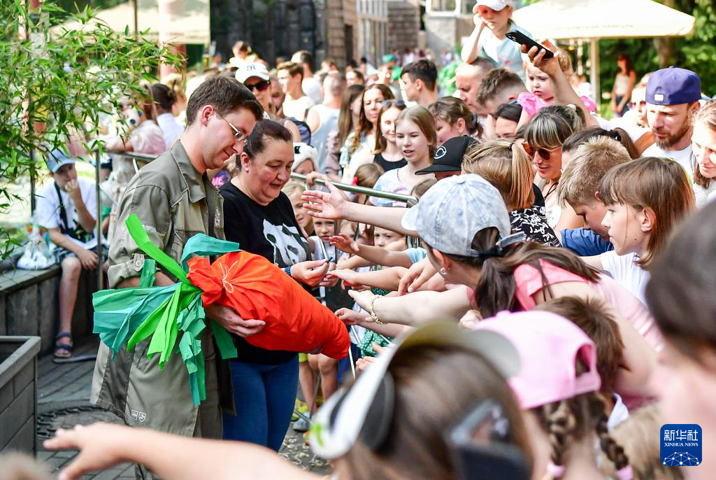 7月31日,在俄罗斯莫斯科动物园,工作人员和游客为大熊猫“如意”制作生日礼物。