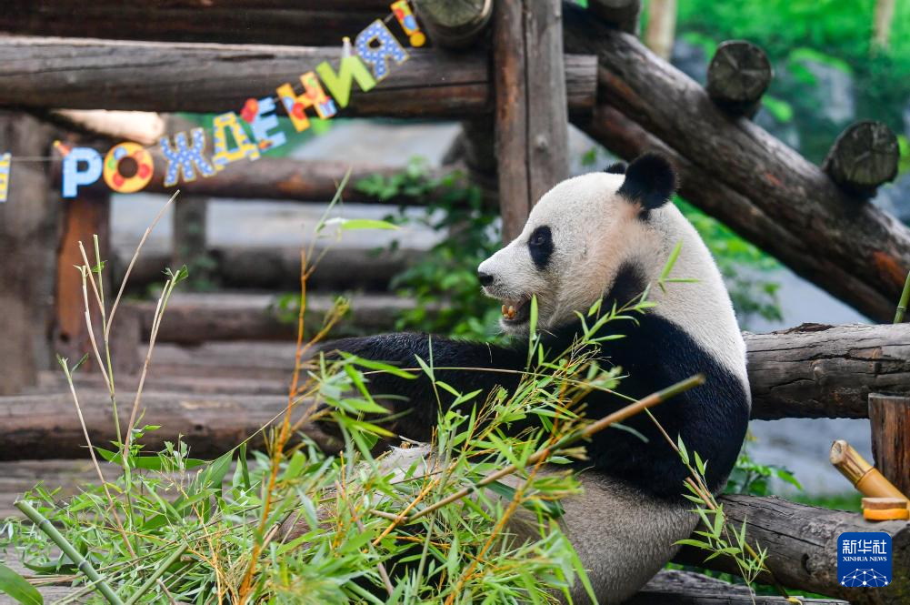 7月31日,在俄罗斯莫斯科动物园,旅俄大熊猫“如意”在生日庆祝活动上享用竹子。
