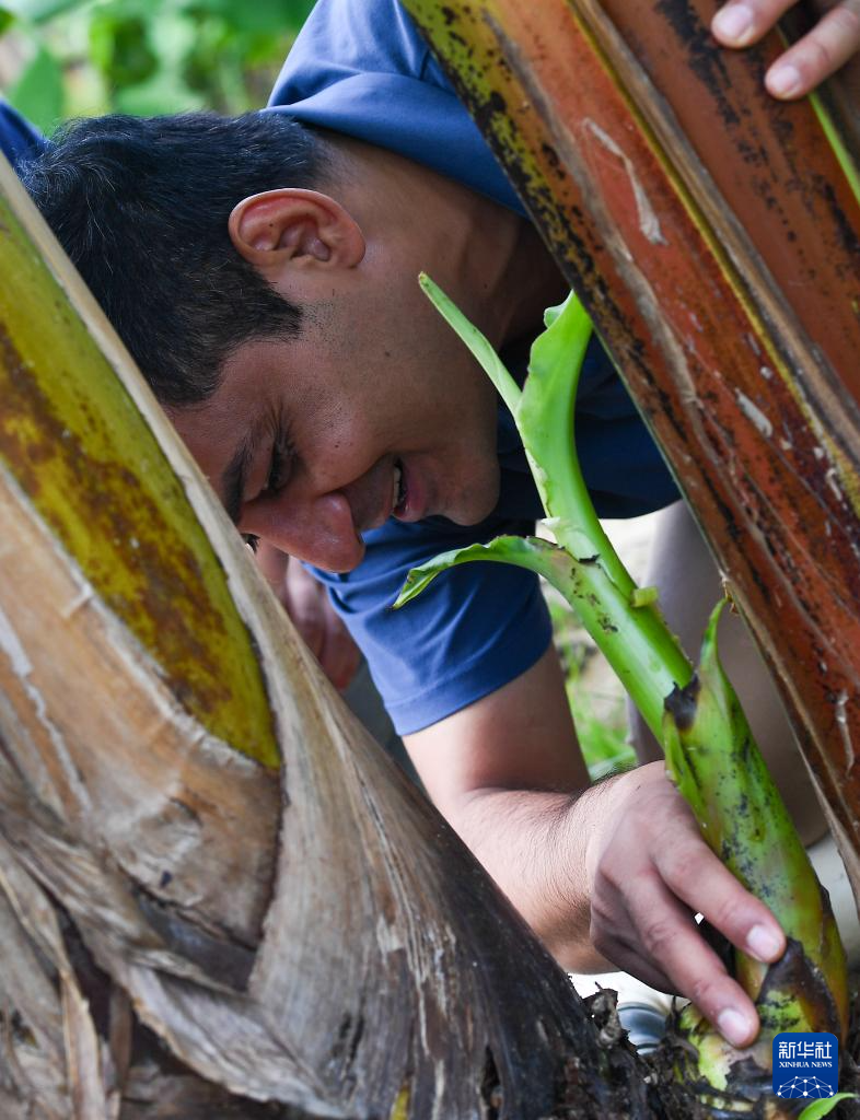 7月29日,瓦西姆·拉扎在海南三亚崖州湾科技城香蕉试验田内查看香蕉。
