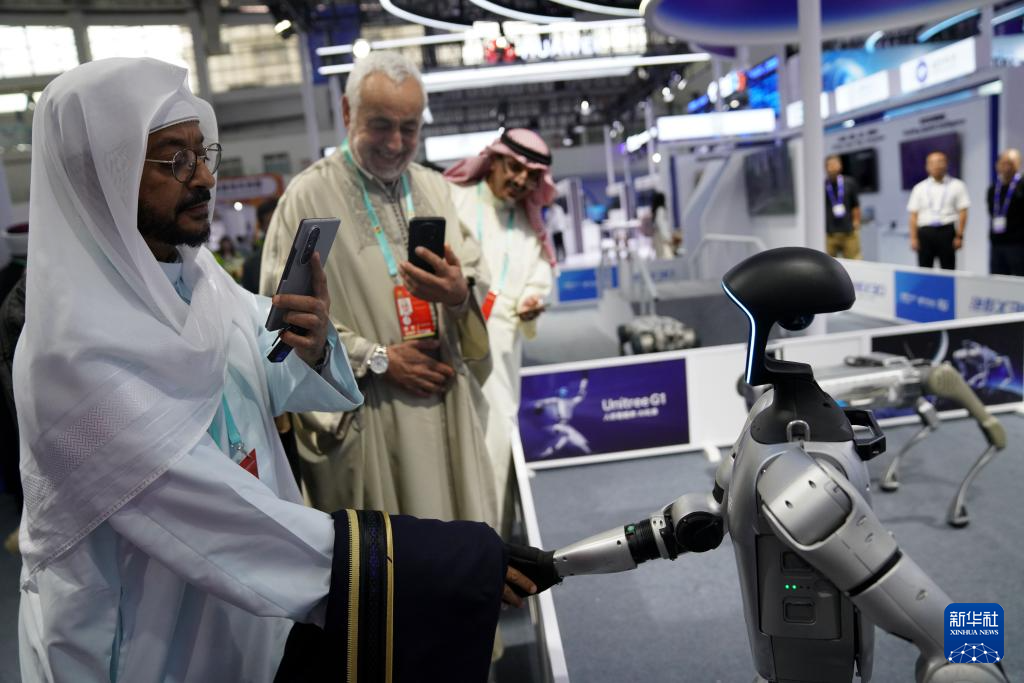8月28日,嘉宾在第七届中国—阿拉伯国家博览会与一款人形机器人握手互动。