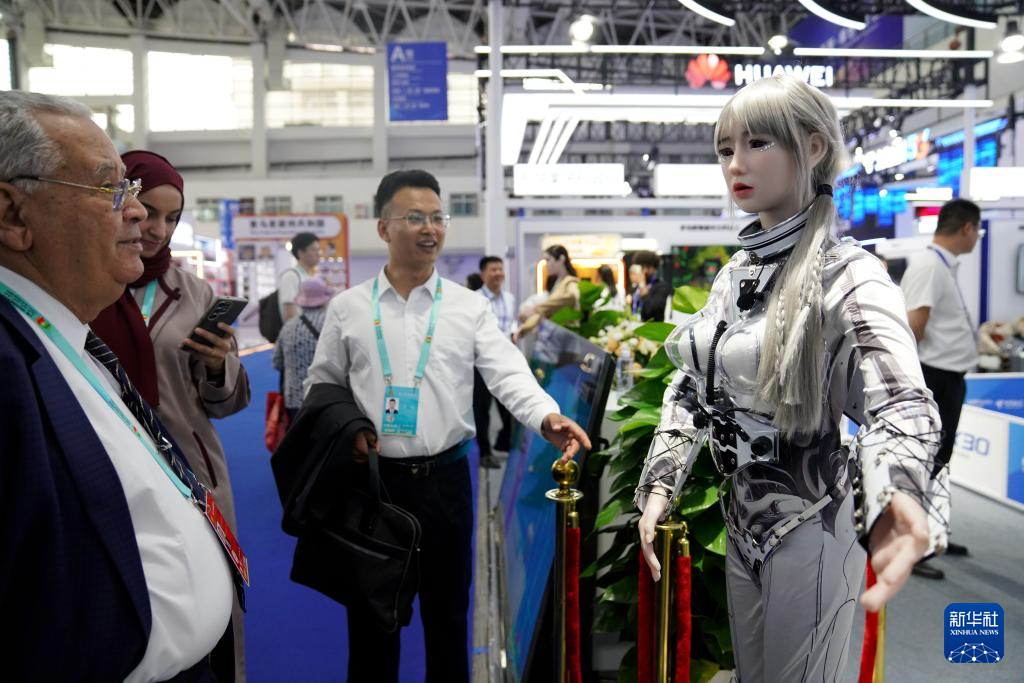 8月28日,嘉宾在第七届中国—阿拉伯国家博览会与一款机器人对话互动。