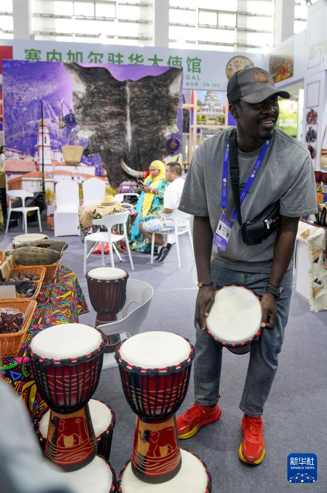 8月28日,塞内加尔展商在第七届中国—阿拉伯国家博览会为观众表演非洲鼓。