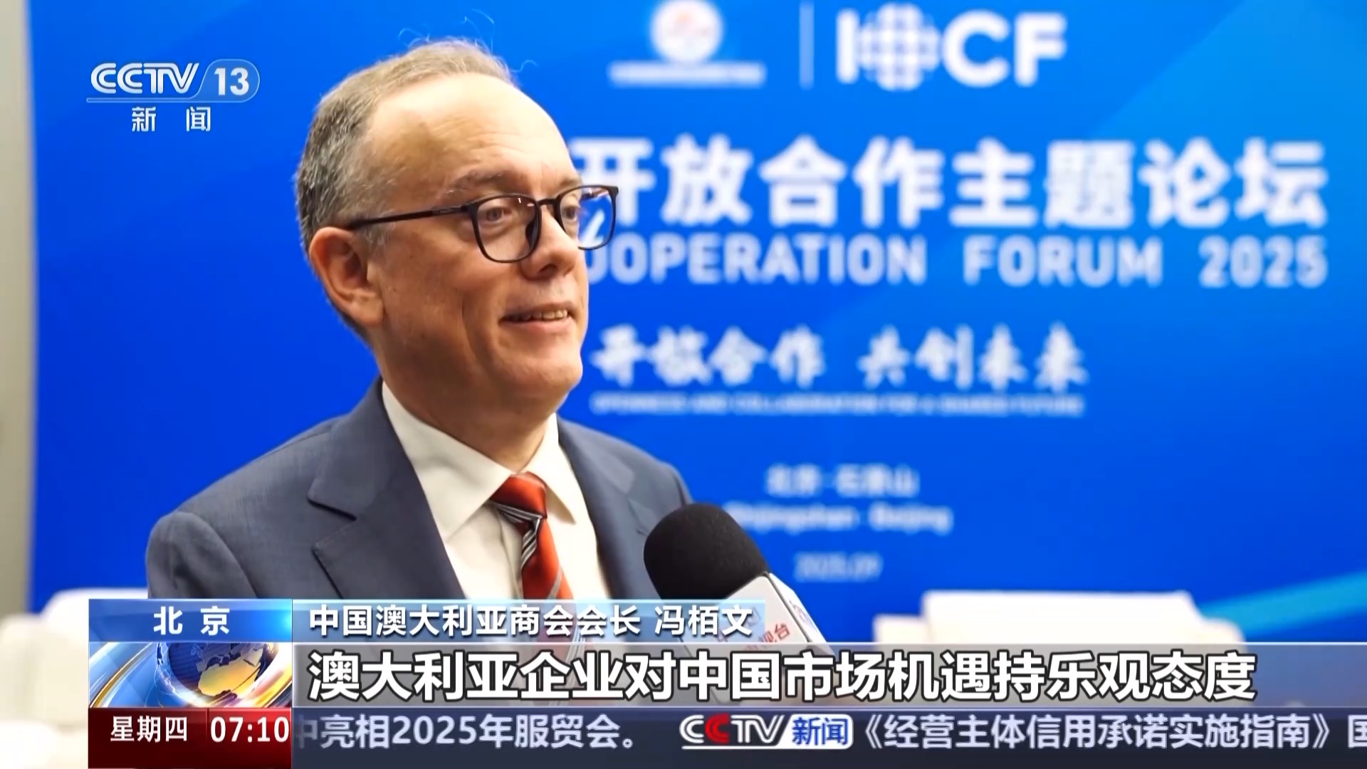 中国澳大利亚商会会长冯栢文:澳大利亚企业对中国市场机遇持乐观态度。我们最新调查显示,70%的受访企业将中国列为未来三年投资计划的首选市场或三大重点市场之一。
