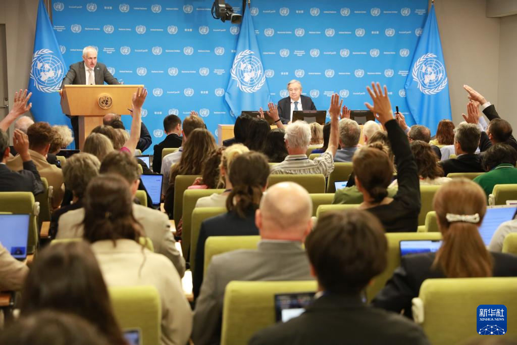 9月16日,在位于纽约的联合国总部,联合国秘书长古特雷斯(后右)在新闻发布会上讲话。