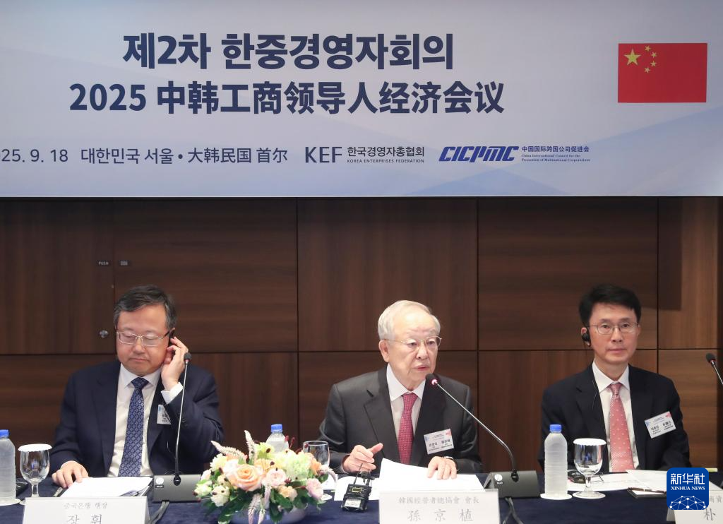 9月18日,韩国经营者总协会会长、韩国希杰集团董事长孙京植(中)在韩国首尔举行的2025中韩工商领导人经济会议上致辞。