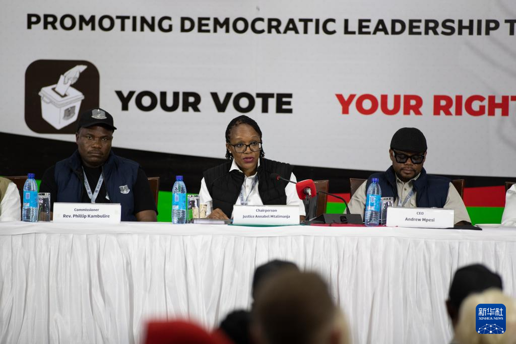 9月24日,在马拉维首都利隆圭,马拉维选举委员会主席安娜贝尔·姆塔利曼贾(中)宣布总统大选结果。