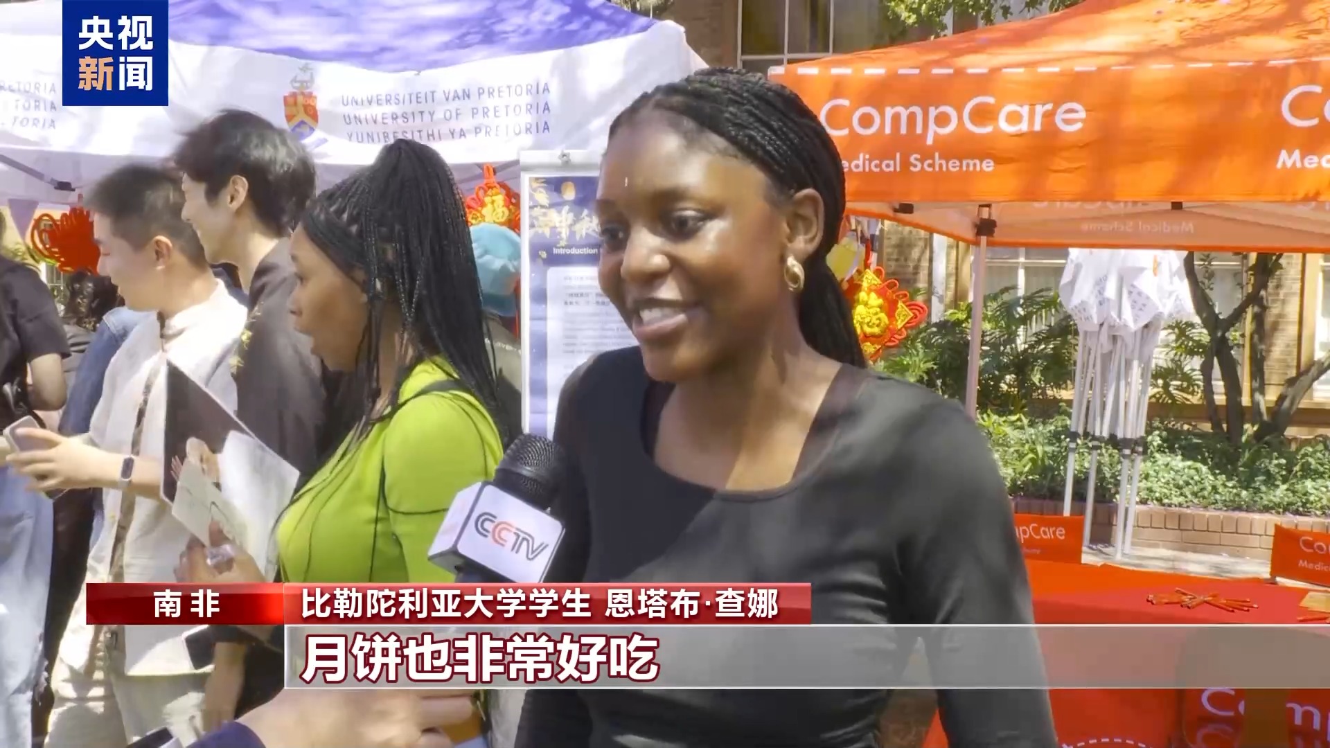 南非比勒陀利亚大学学生恩塔布·查娜:中秋节让我觉得很温馨,这是我第一次看到中国人穿汉服。我品尝了中国茶,一切都很棒,月饼也非常好吃。