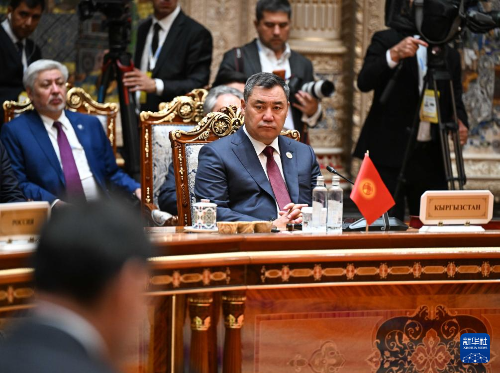 10月10日,在塔吉克斯坦首都杜尚别,吉尔吉斯斯坦总统扎帕罗夫(中)出席独联体国家元首理事会会议。