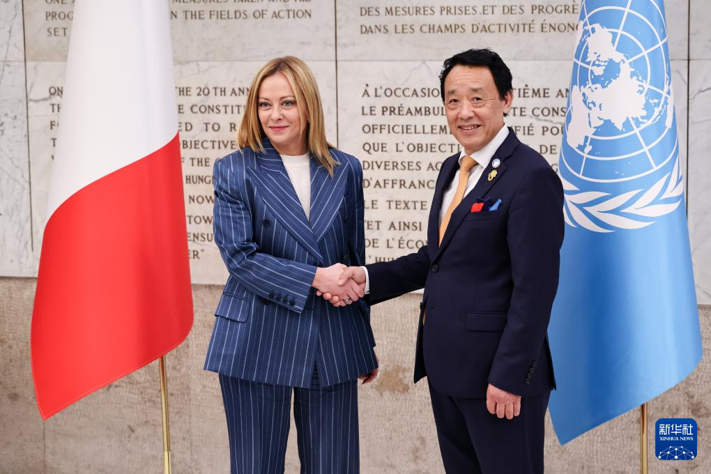 10月16日,在位于意大利罗马的联合国粮食及农业组织总部,意大利总理梅洛尼(左)与联合国粮农组织总干事屈冬玉握手。