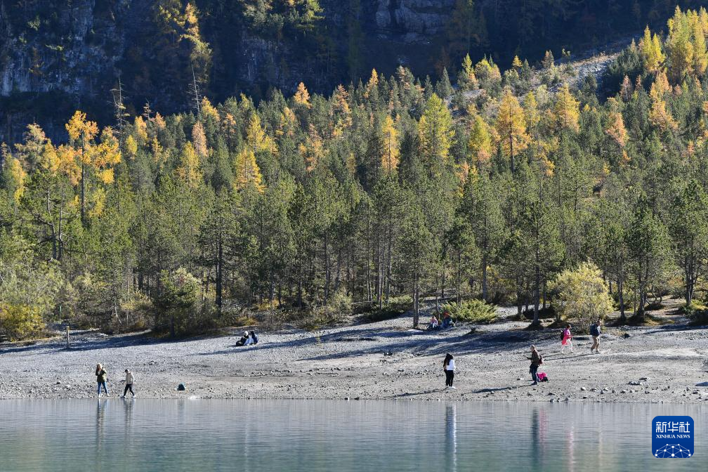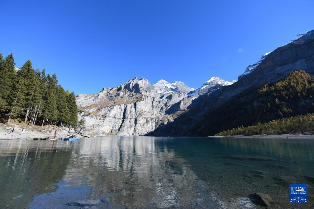 10月18日,人们在瑞士伯尔尼州厄希嫩湖边欣赏秋景。