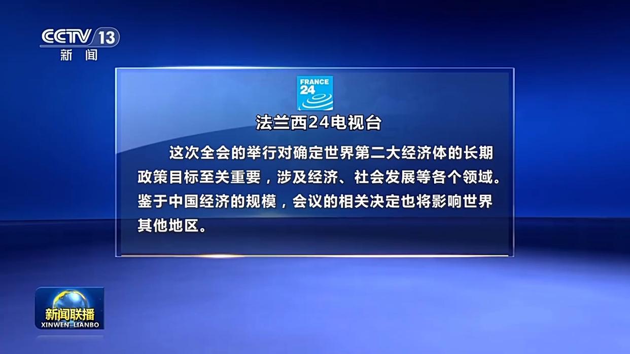 法兰西24电视台报道说,这次全会的举行对确定世界第二大经济体的长期政策目标至关重要,涉及经济、社会发展等各个领域。鉴于中国经济的规模,会议的相关决定也将影响世界其他地区。