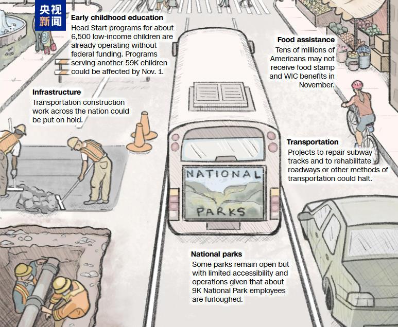 数以千万计的美国人11月可能无法领取食品券和妇女、婴儿和儿童特别营养补充计划的福利;美国全国的交通基础设施建设工作可能会暂停;修复地铁、公路或其他交通运输的项目可能会暂停;一些国家公园仍然开放,但由于约9000名国家公园员工被迫休假,公园运营能力受到影响。