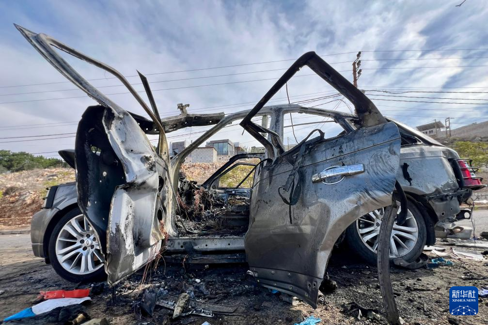 这是11月2日在黎巴嫩南部一村庄拍摄的遭袭汽车残骸。