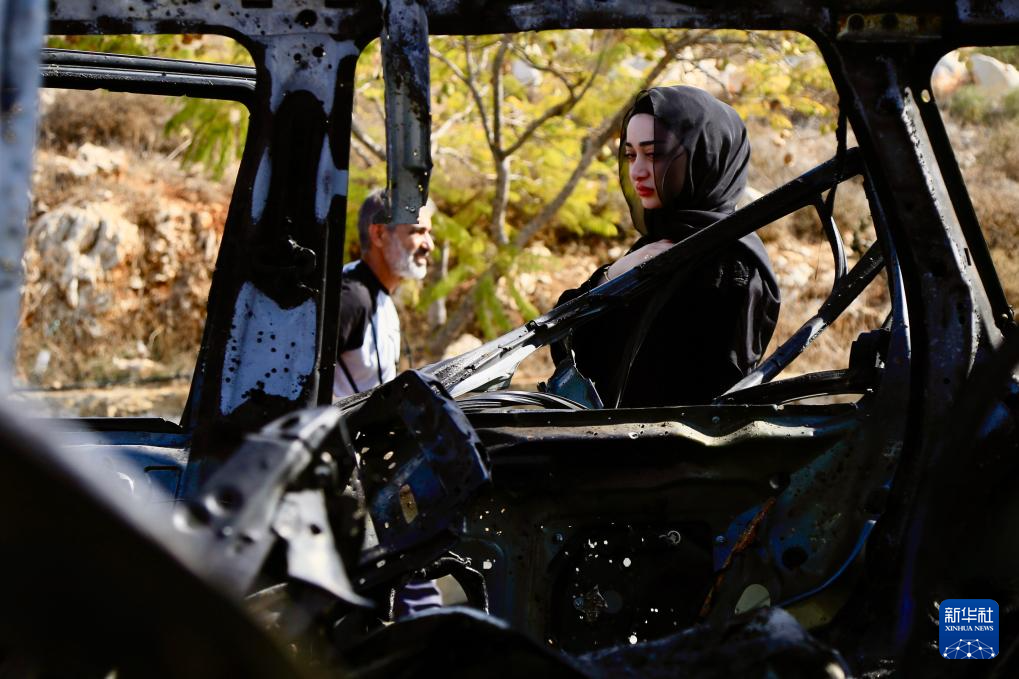 11月2日,在黎巴嫩南部一村庄,一名女子看着遭袭汽车残骸。