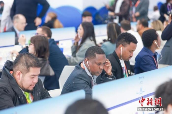 11月5日,第八届中国国际进口博览会暨虹桥国际经济论坛开幕式在国家会展中心(上海)举行。图为外国媒体记者在新闻中心收听开幕式上的嘉宾发言。中新社记者 贾天勇 摄