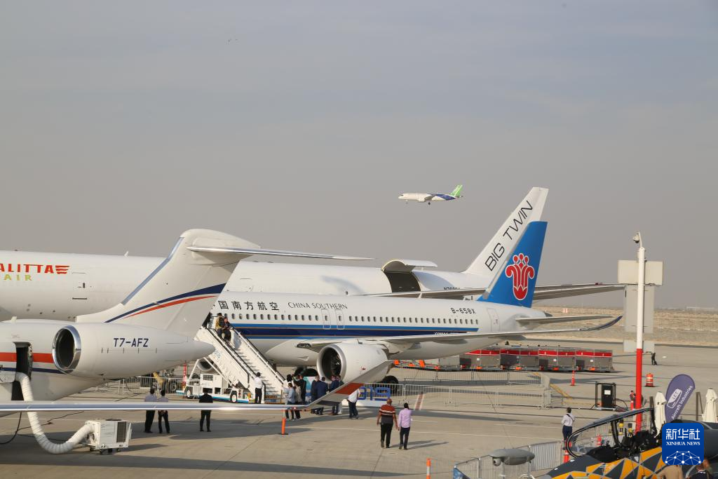 11月17日,在阿联酋迪拜,中国商飞的C919飞机进行飞行展示,地面上停着的是中国南航的C919飞机。