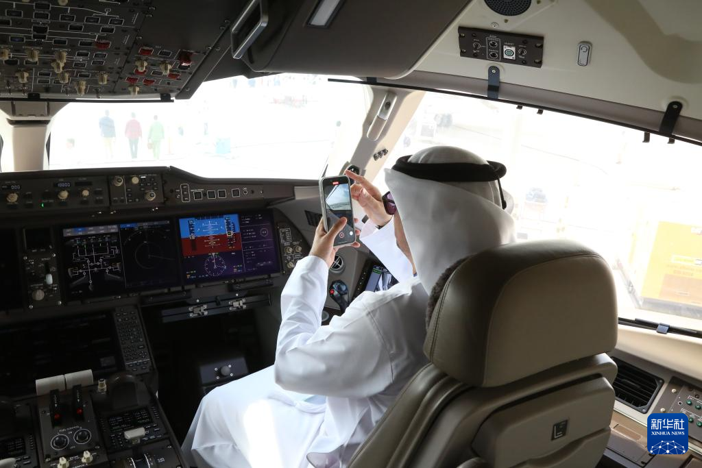 11月17日,在阿联酋迪拜,观众在2025迪拜航空展上体验C919飞机。