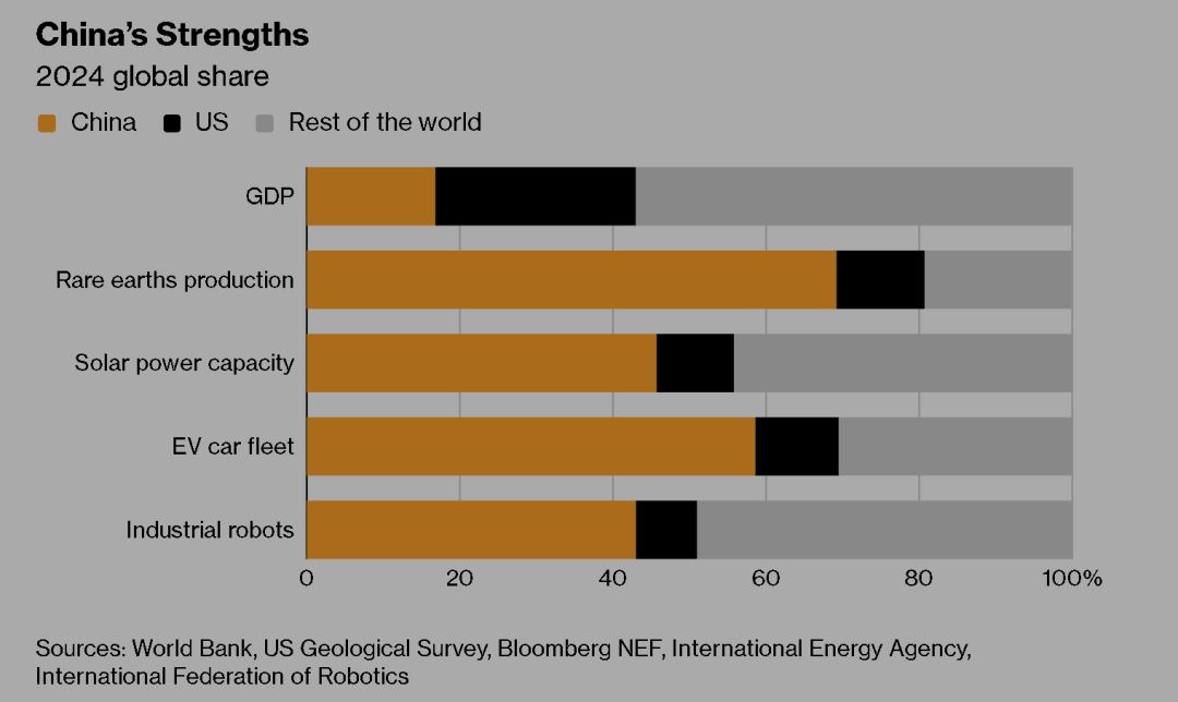 比姆贴出的一张直观的图表亦显示,尽管中国的GDP与美国还有差距,但在稀土生产、太阳能装机容量、电动车数量以及工业机器人等诸多关系未来发展的重要领域,中国都已大幅领先。