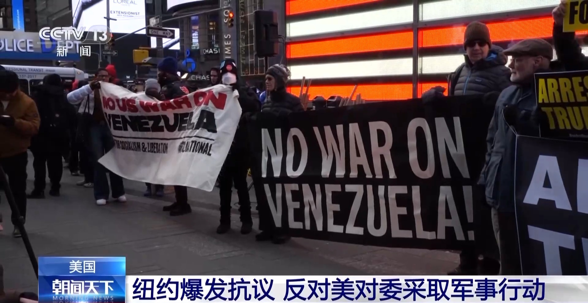 央视记者许弢:当地时间1月3日,在美国对委内瑞拉采取军事行动后,全美多地都爆发了抗议活动。在纽约时报广场,数百人聚集在这里,反对美国对委内瑞拉采取军事干预。