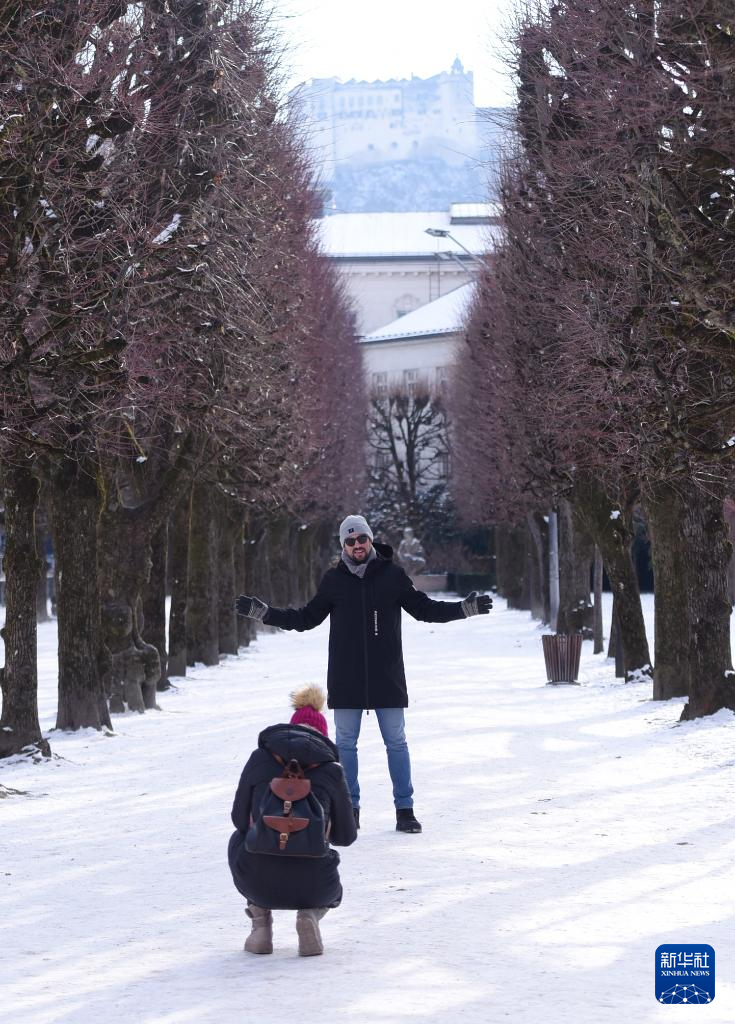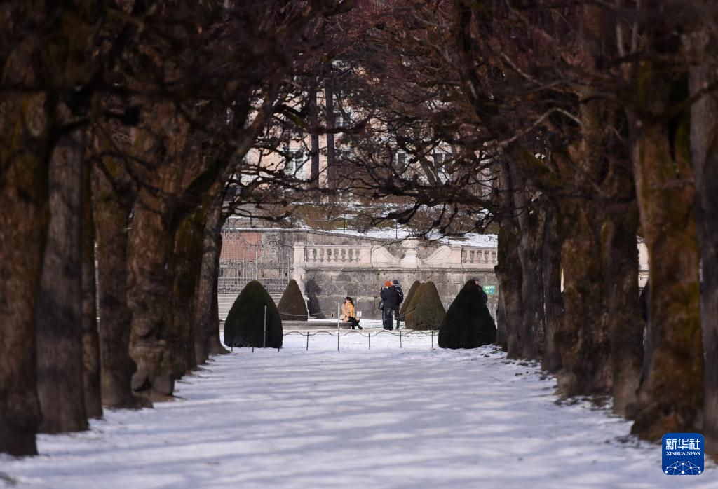 这是1月7日在奥地利萨尔茨堡米拉贝尔宫拍摄的雪景。