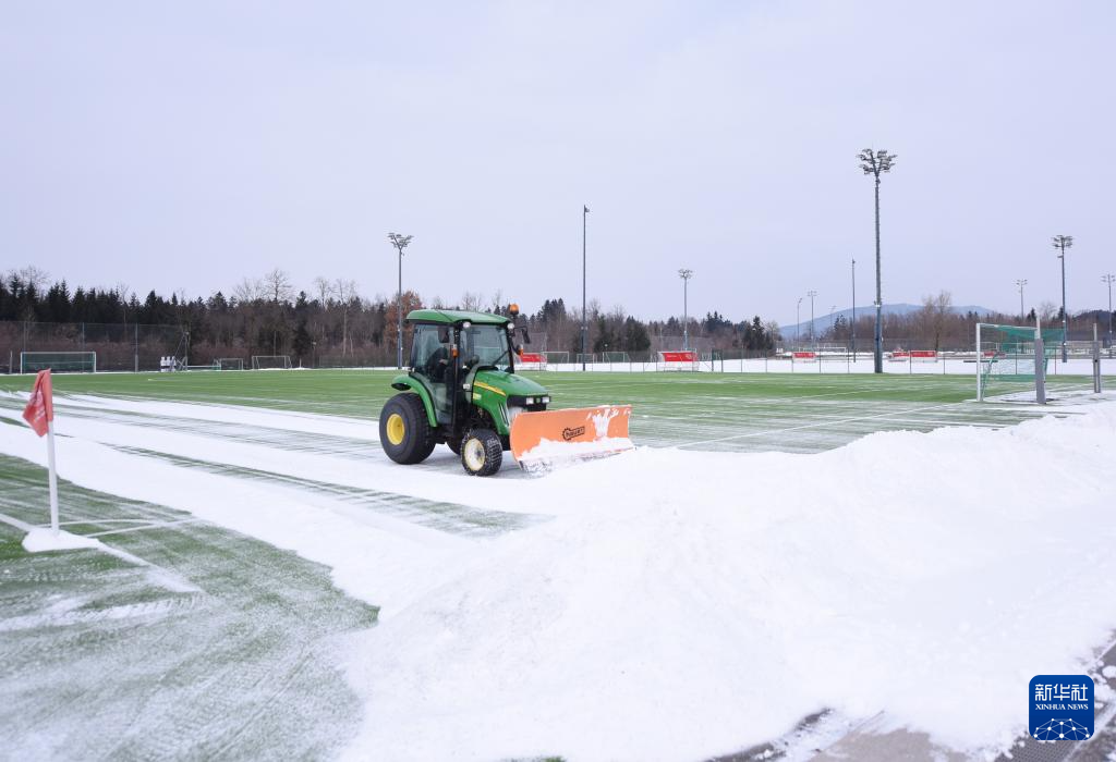 1月7日,在奥地利萨尔茨堡,一辆铲车在铲除球场上的积雪。