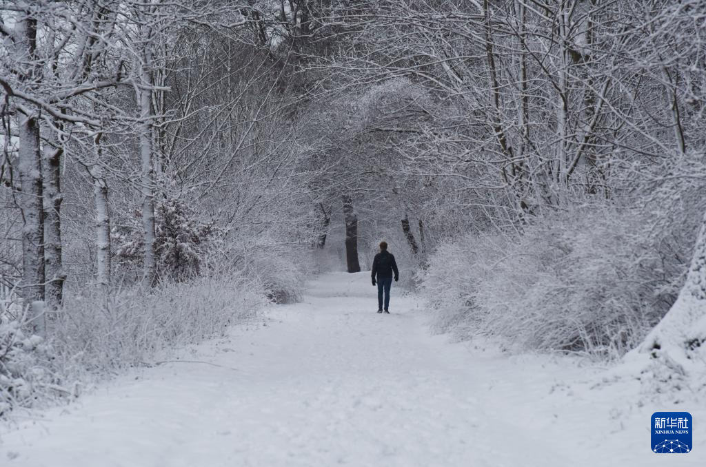 1月7日,在荷兰海牙,一名男子在雪地上行走。