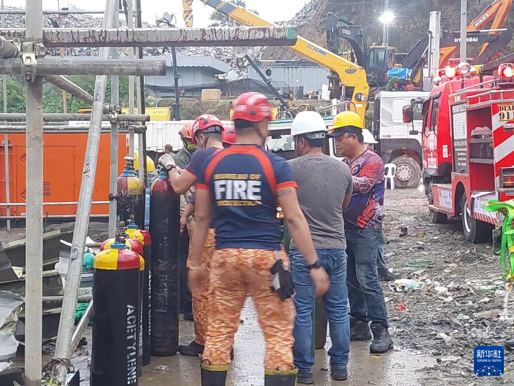 1月10日,在菲律宾宿务,救援人员在发生塌陷事故的垃圾填埋场开展搜救工作。