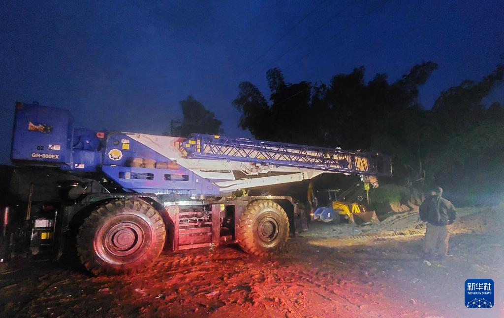 1月10日晚,在菲律宾宿务,一台重型设备抵达发生塌陷事故的垃圾填埋场,准备参与救援工作。