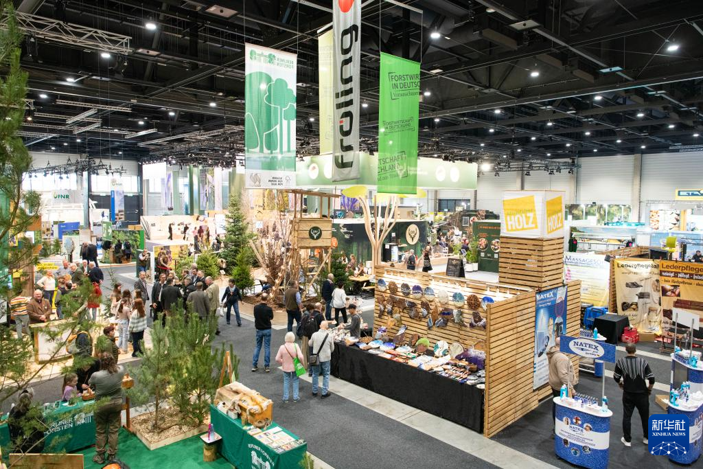 1月16日,在德国首都柏林,一名男子在柏林国际绿色周现场参观一款桑拿木屋产品。