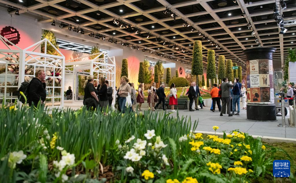 1月16日,在德国首都柏林,一名摊主(左一)在柏林国际绿色周现场叫卖花卉种球。