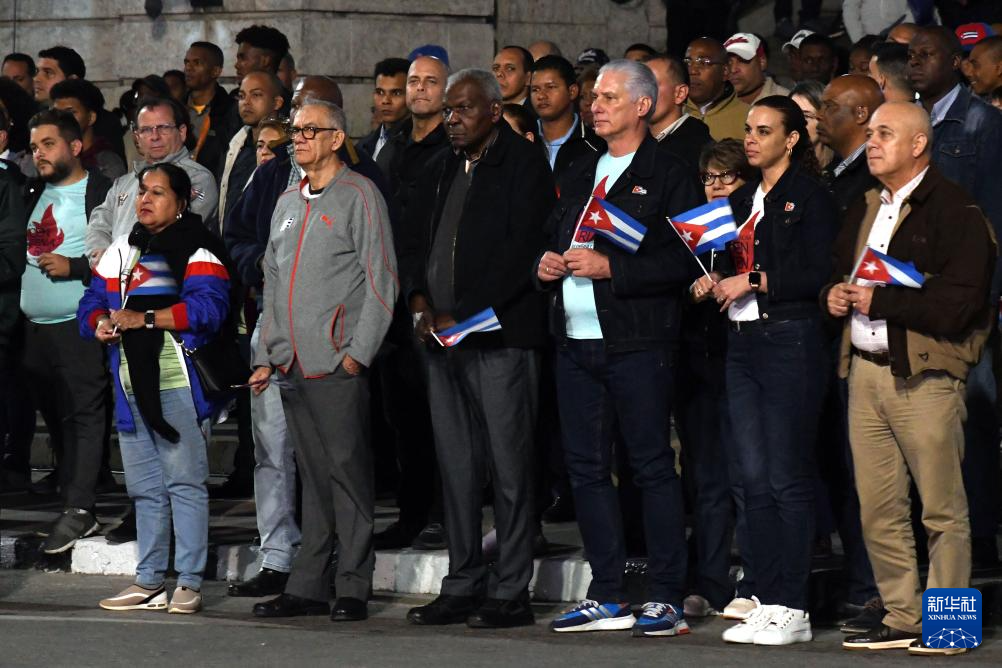 1月27日,在古巴首都哈瓦那,古巴国家主席迪亚斯-卡内尔(前排右三)出席火把游行活动。