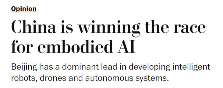 文章表示,如今,同样的模式正在重新上演。中国正以同样明确的力度进军具身人工智能领域——即机器人、无人机等硬件系统利用AI感知环境、自主决策并从物理交互中学习,而非仅执行预设指令。尽管尚未实现商业化或大规模部署,但中国当前在具身人工智能领域的努力可能使其取得早期领先,并最终转化为显著的经济与地缘政治优势。