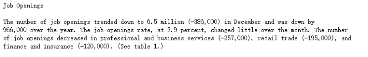 报道称,因为政府停摆而推迟发布的职位空缺和劳动力流动报告显示出,在经历了数月的“微小变化”之后,美国12月份的职位空缺数量大幅下降,表明对新员工的需求有所减少。报道还指出,上周美国申请失业救济金的人数创下两个月来的最大增幅。美国劳工部发布的数据显示,截至1月31日的一周,美国首次申请失业救济金的人数为23.1万人,和前一周的人数相比增加了22000人。