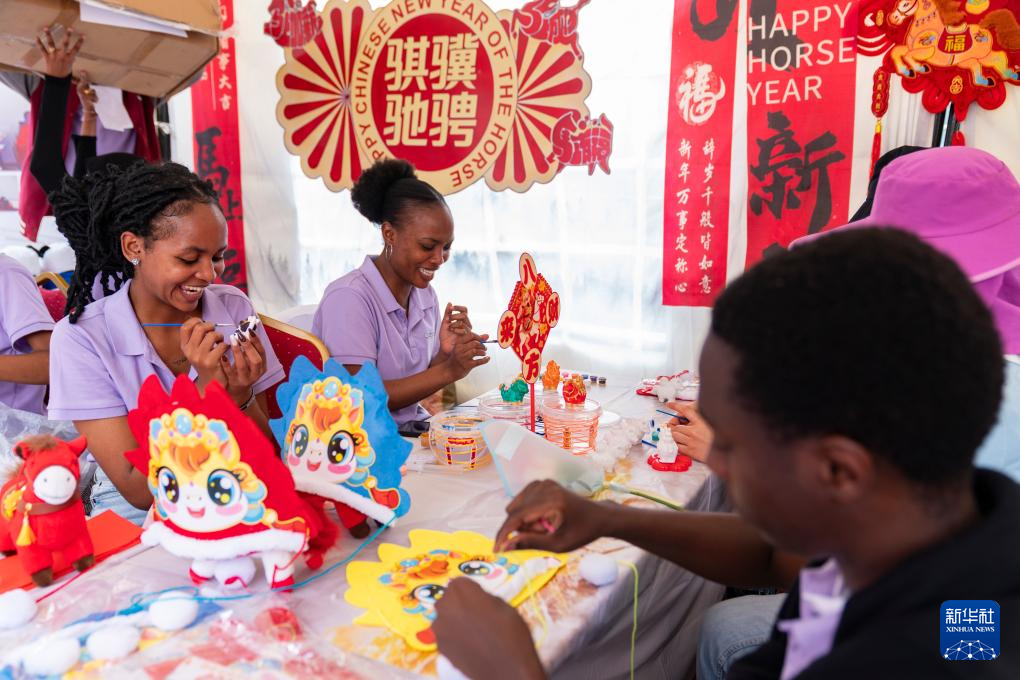 2月8日,人们在肯尼亚首都内罗毕举行的中国春节庙会上体验做手工。