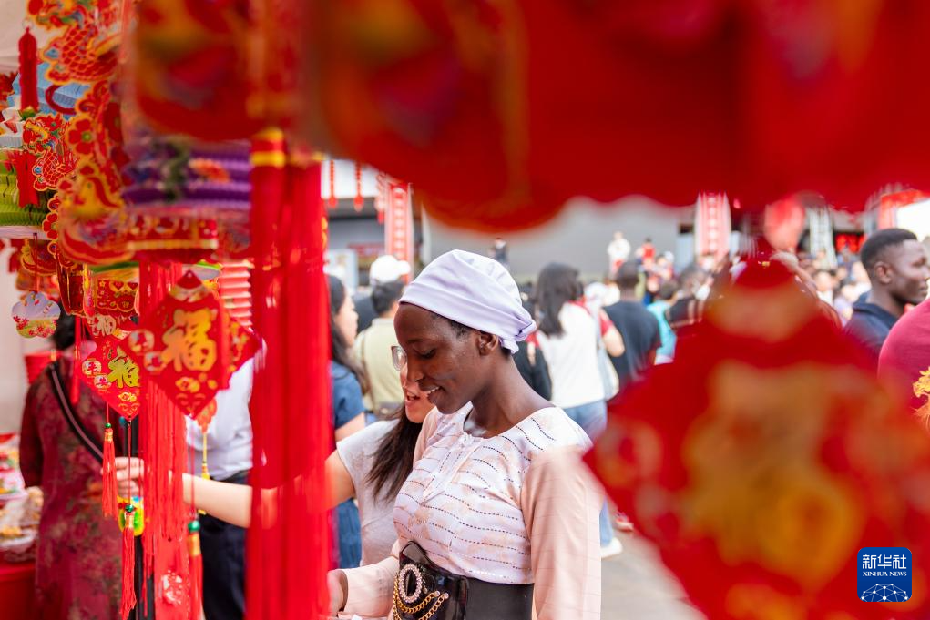 2月8日,一名当地居民在肯尼亚首都内罗毕举行的中国春节庙会上欣赏挂饰。