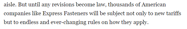 文章强调,法院的裁决对许多其他因第232条款关税而增加成本的美国公司来说至关重要。无论是在此案还是其他任何案件中。第232条款必须进行修订,但在任何修订案最终成为法律之前,像Express Fasteners这样的数千家美国公司不仅要承受新关税的冲击,还要面对没完没了、不断变化的关税适用规则。