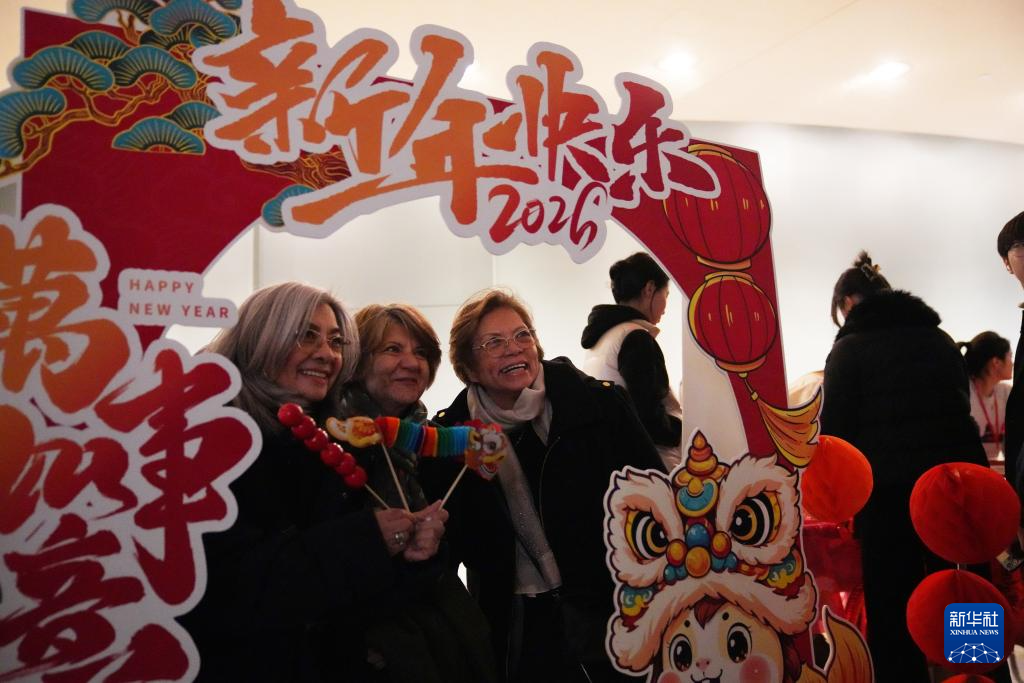 2月12日,在位于纽约的联合国总部,人们在“马年新春”主题打卡门框前留影。