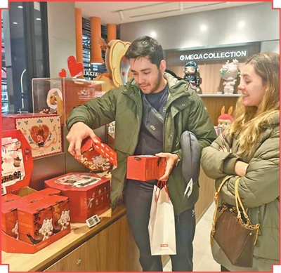 墨西哥游客豪尔赫(左)在马德里的泡泡玛特门店内挑选新春潮玩。